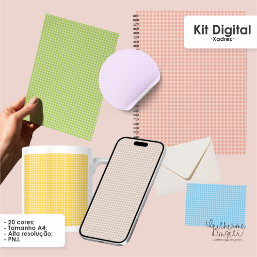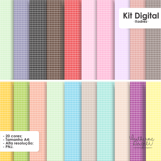 Transforme seus projetos de papelaria com o nosso Kit Digital Exclusivo! Este kit contém 15 cores vibrantes e uma estampa xadrez perfeita para criar e personalizar itens como cartões, cadernos, adesivos e muito mais.